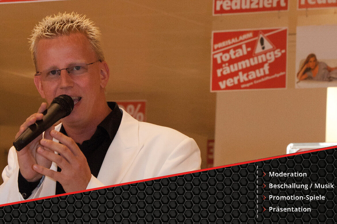 Mit professioneller Moderation, dem Event, der Location und Ihrem Unternehmen angepasster musikalischer Begleitung, Aktions-Highlights z.B. mit dem bewährten Glücksrad, Give-Away Aktionen oder produktorientierten Wettbewerben in Verbindung mit hochwertigster Technik steigern wir nicht nur Ihre direkten Umsätze, sondern auch nachhaltig die Erinnerung und Wertigkeit Ihrer Produkte und Dienstleistungen.